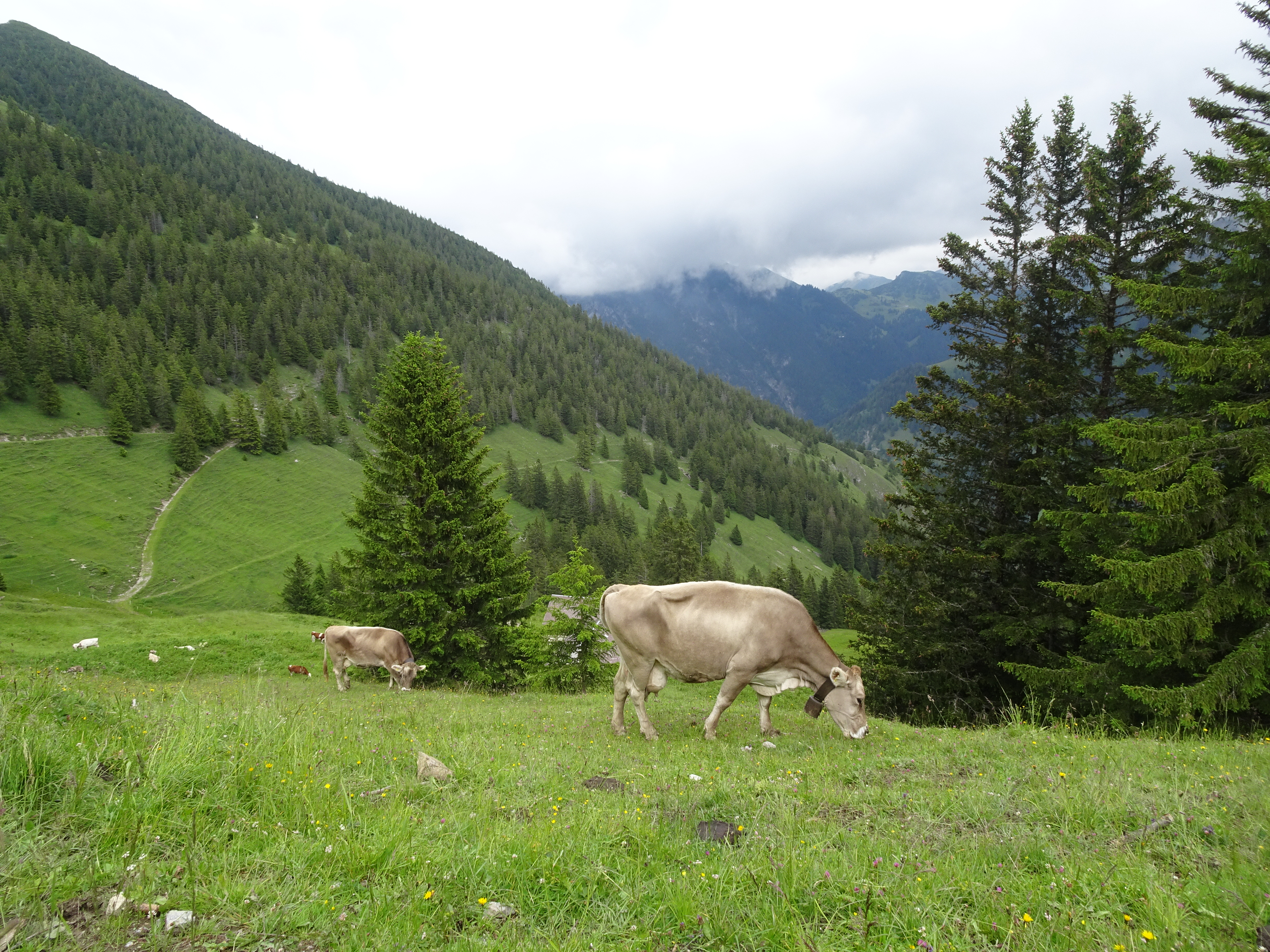 Après la roche vient la verdure, où nous entendons au loin les vaches et leurs cloches qui résonnent dans les montagnes. Avec ça, impossible de les perdre !