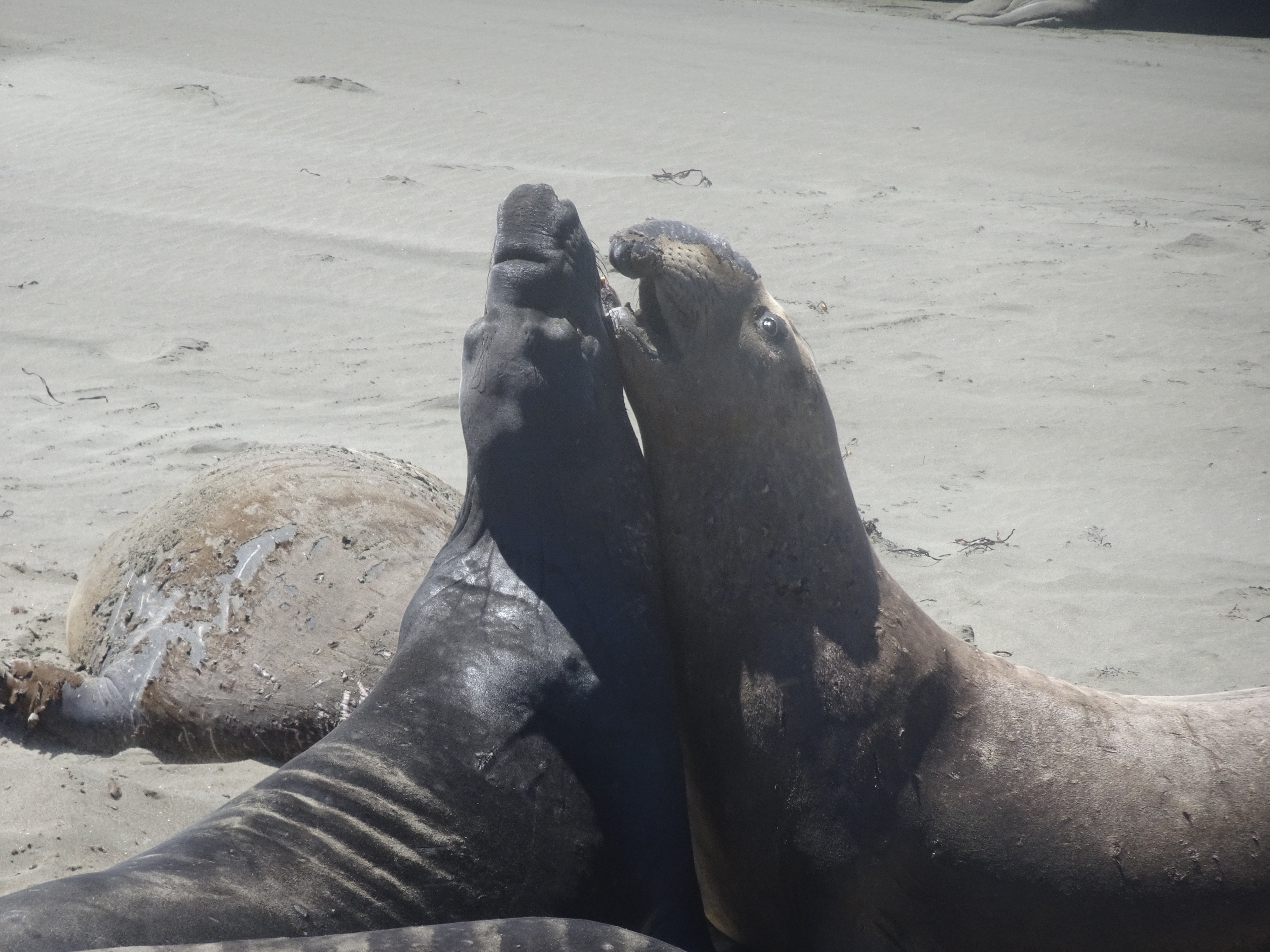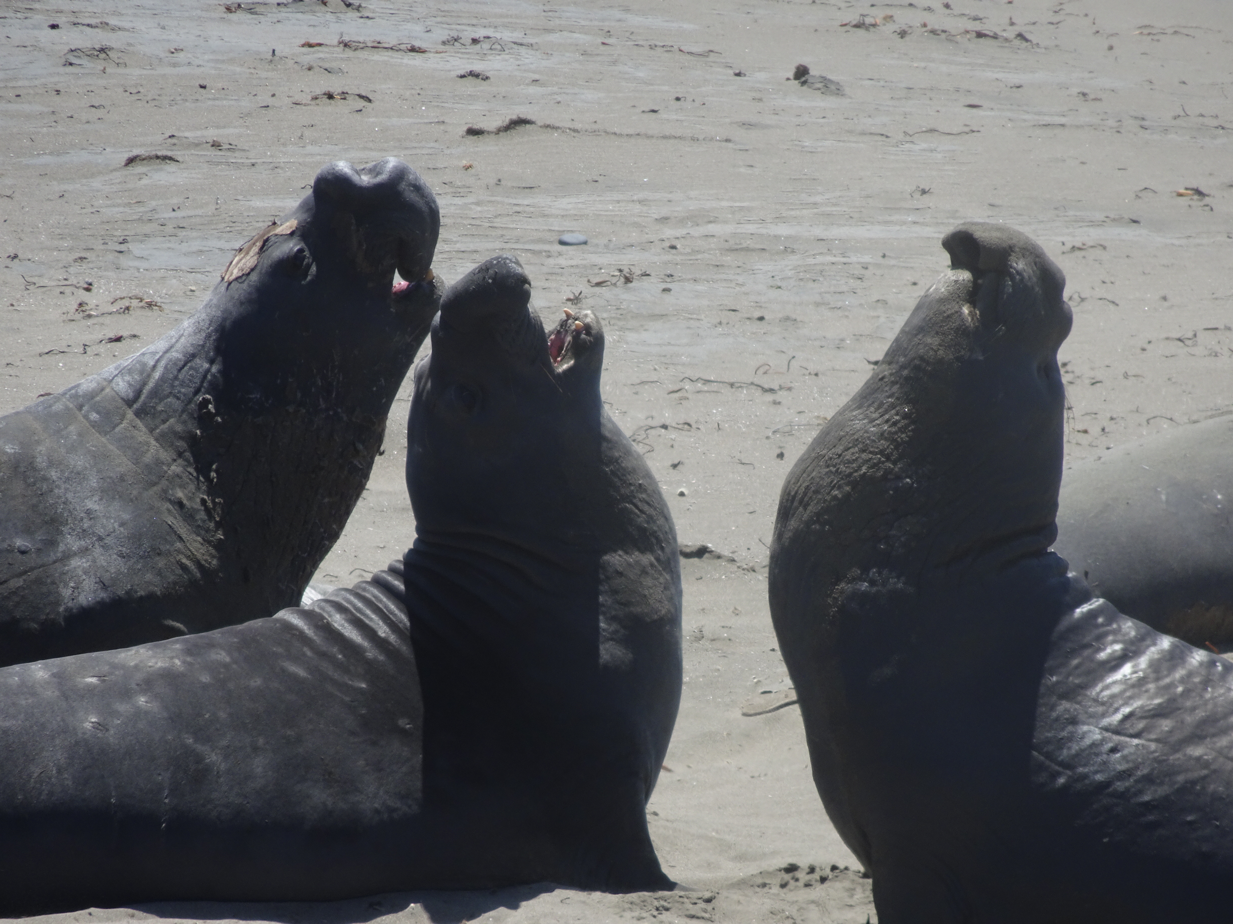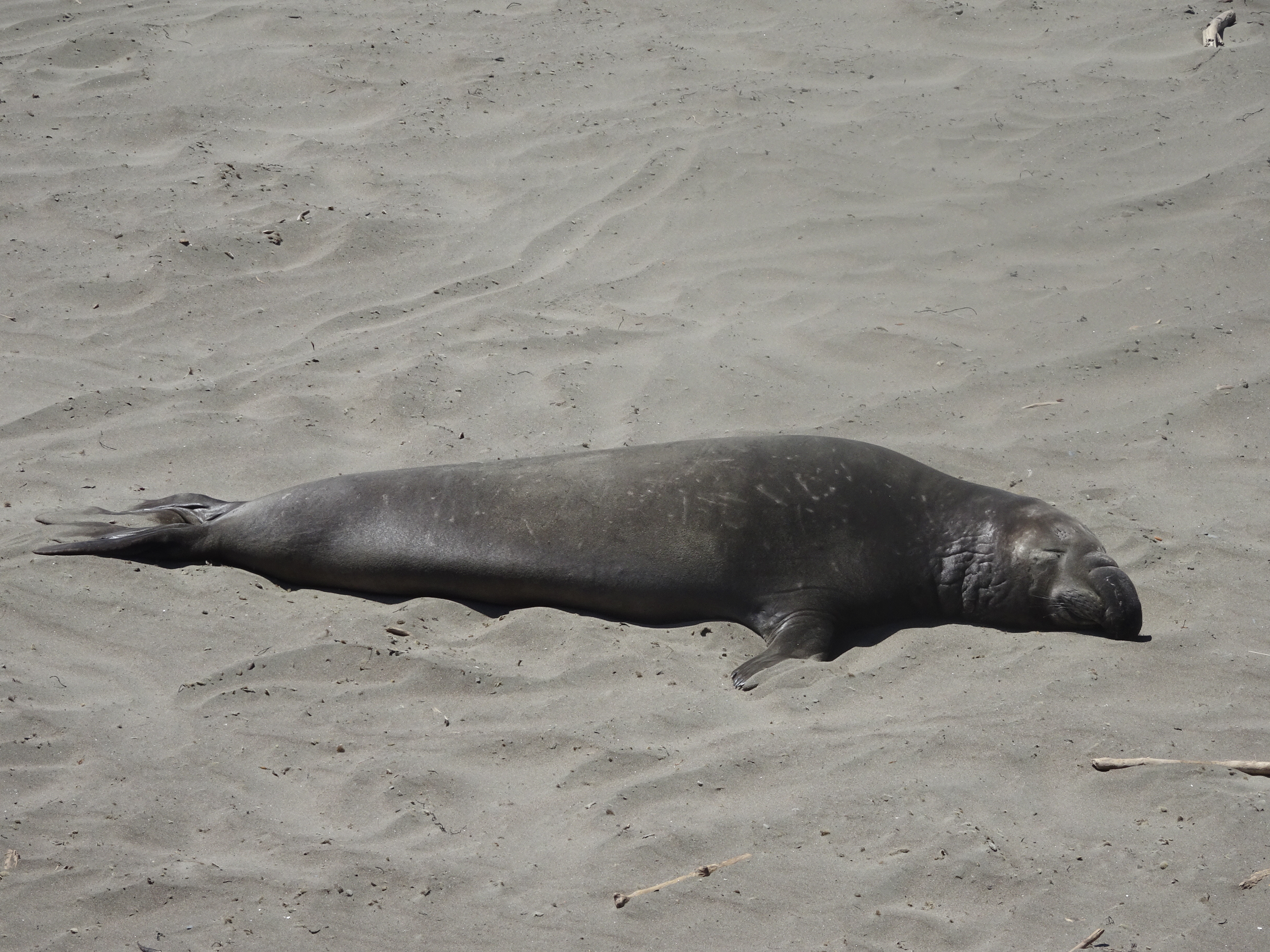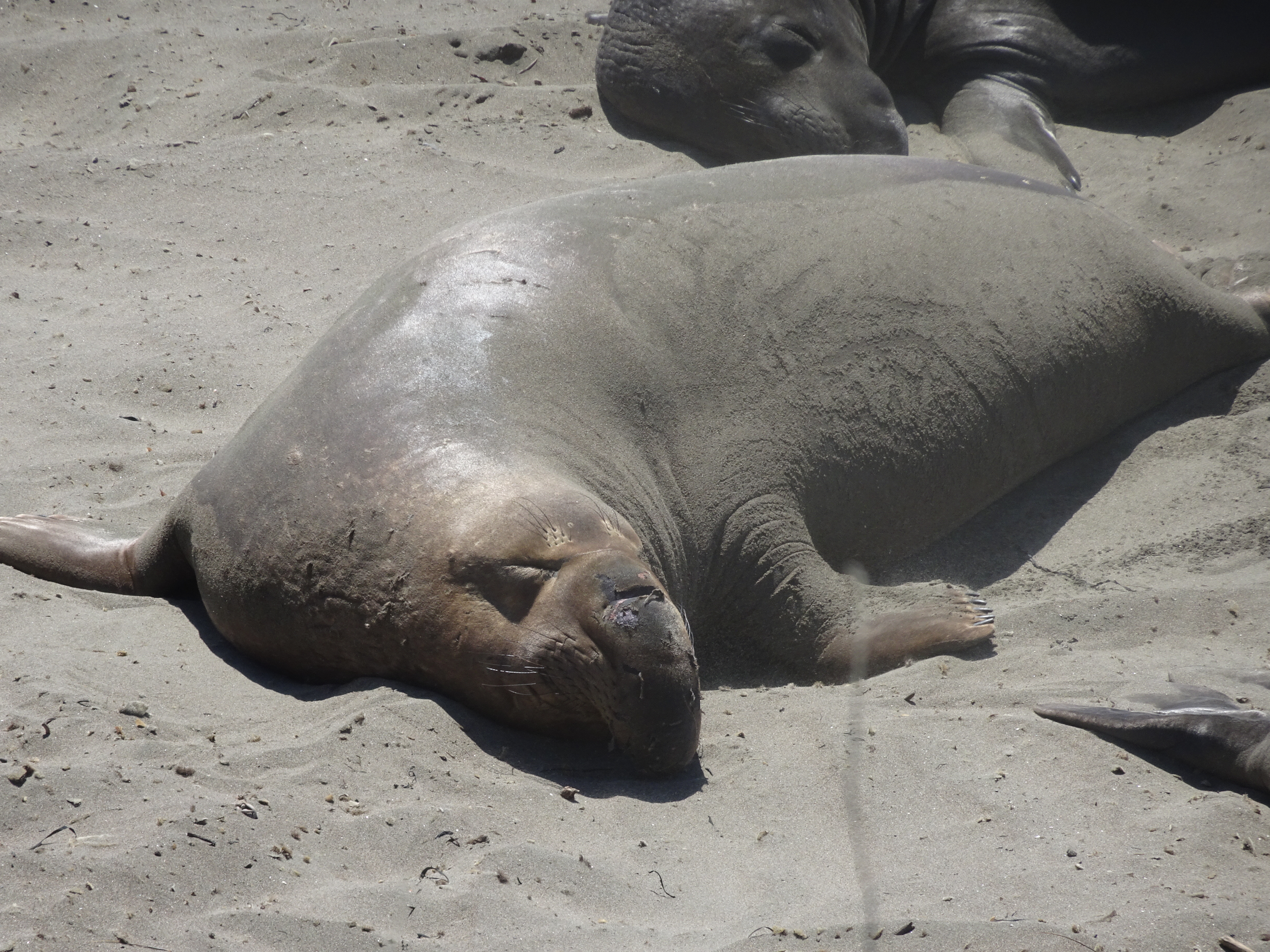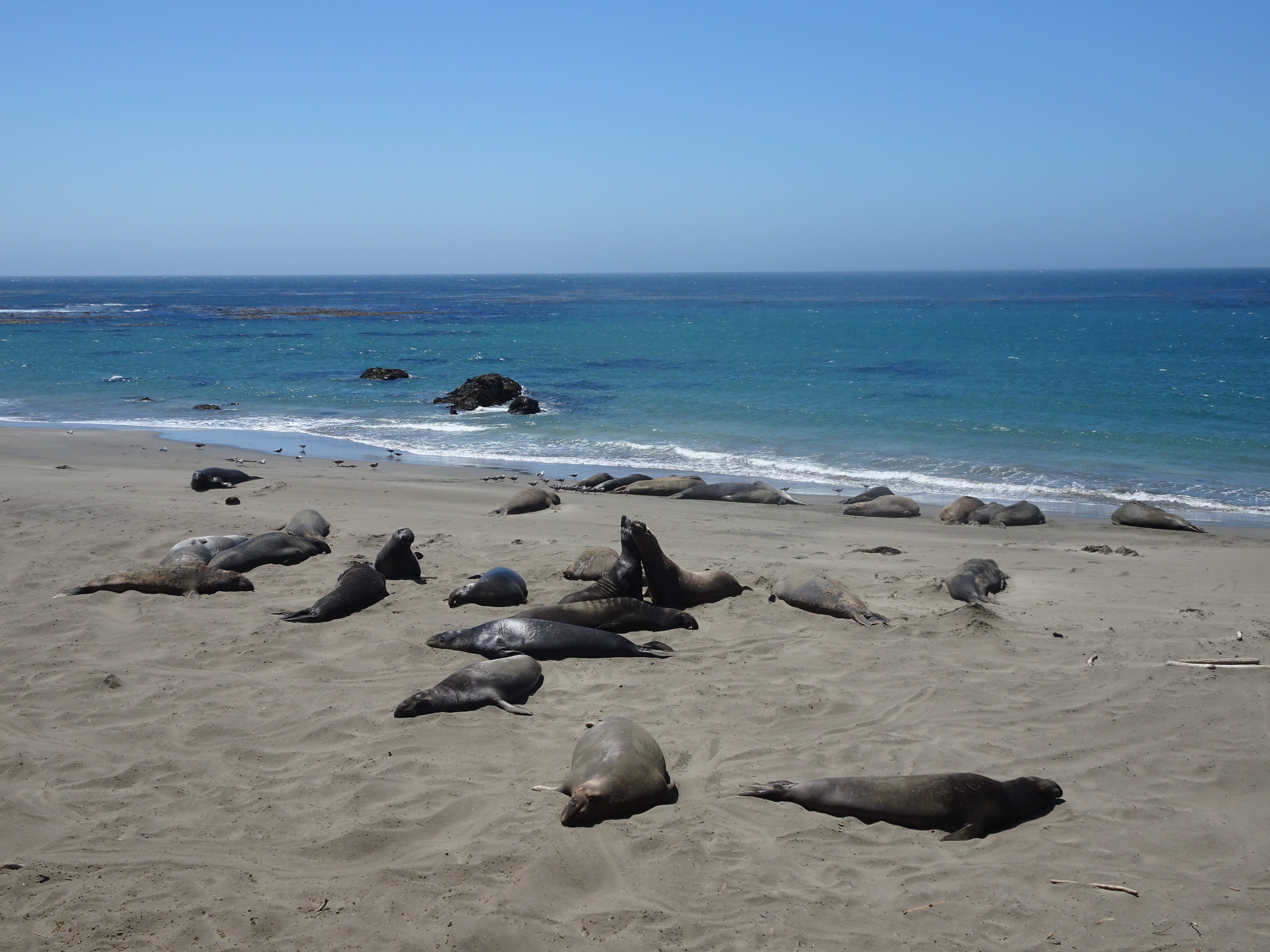 Notre premier arrêt s’est fait près de la plage de Piedras Blancas à San Simeon, pour y observer les éléphants de mer. A cet endroit, une colonie de 17000 éléphants de mer (oui, vous lisez bien !) s’est établie. Ils sont appelés ainsi en raison de leur museau en forme de trompe qu’ont les mâles. Ni mon copain ni moi n’avions jamais vu ces animaux en vrai, nous avons donc passé un très chouette moment. Comment les décrire ? Ils restent là, couchés (affalés serait le bon mot) sur le sable, ronflent, relèvent parfois la tête pour mugir. Parfois, certains se dirigent difficilement vers l’océan, tels des vers de terre tout gras (leur façon de se mouvoir est vraiment à mourir de rire). Parfois, d’autres se battent. Mais attention, ils peuvent vraiment être violents entre eux, à voir les plaies et cicatrices sur les cous de plusieurs d’entre eux. Ce sont des animaux impressionnants, de par leur taille, leur poids (les mâles peuvent atteindre 5 mètres de long et peser jusqu’à 2300 kilos) et leur mugissement. Si vous voulez vous assurer qu’il y a bien des éléphants de mer présents avant votre visite, vous pouvez toujours regarder sur cette webcam.