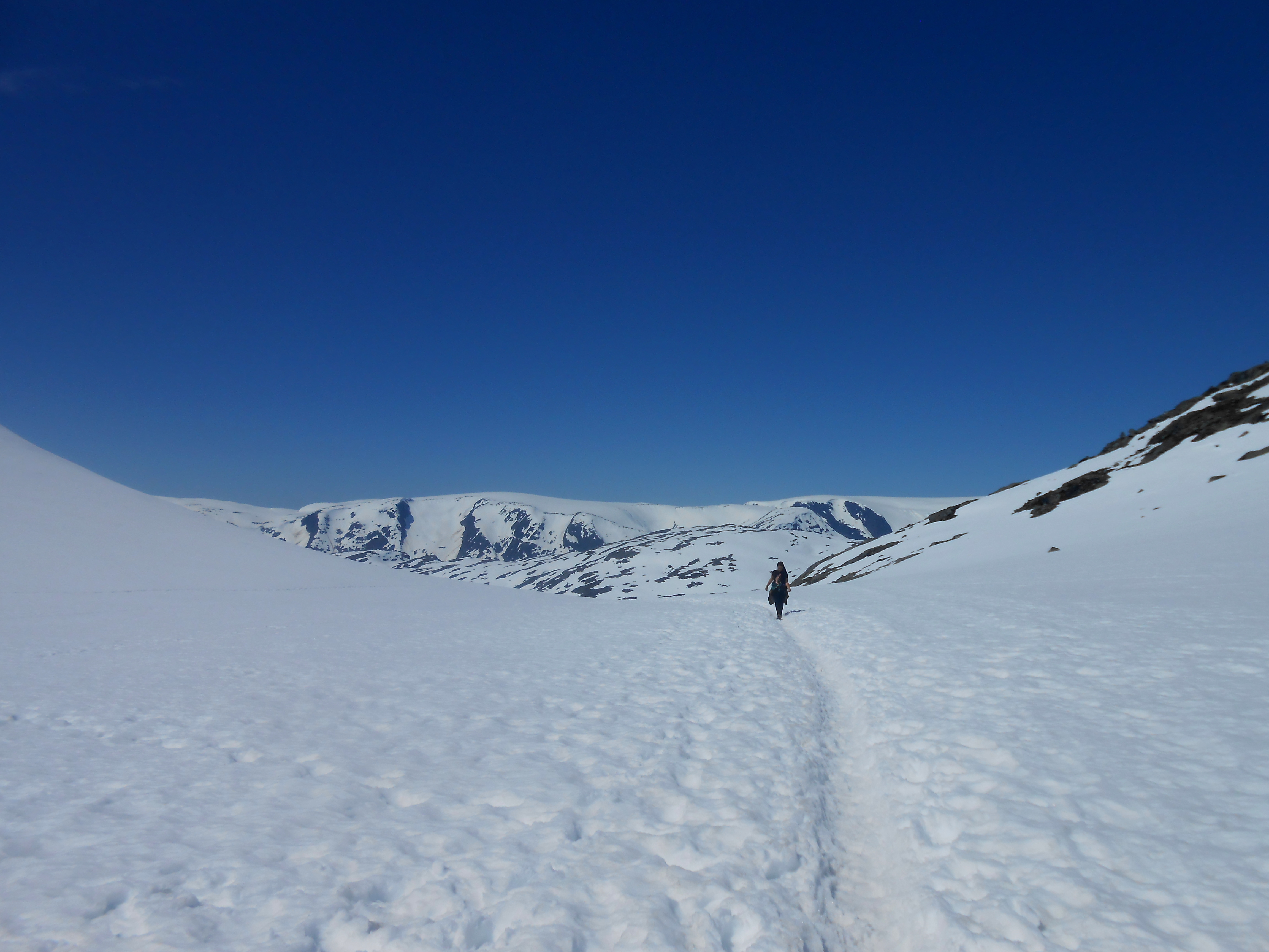 Cette première étape éreintante passée, on arrive sur un plateau et c’est là que la neige fait sa grosse apparition. Nous marchons et nos pieds passent au travers de la neige pour arriver à plusieurs reprises dans de petits cours d’eau. Nos pieds sont vite trempés mais les paysages sont tellement beaux qu’on l’oublie vite ! Le chemin est indiqué à l’aide de « T » peints à la bombe sur des pierres, impossible de se perdre… Nous atteignons un panneau nous indiquant que nous avons marché 2km depuis le parking, et qu’il en reste donc 9 jusqu’au rocher.