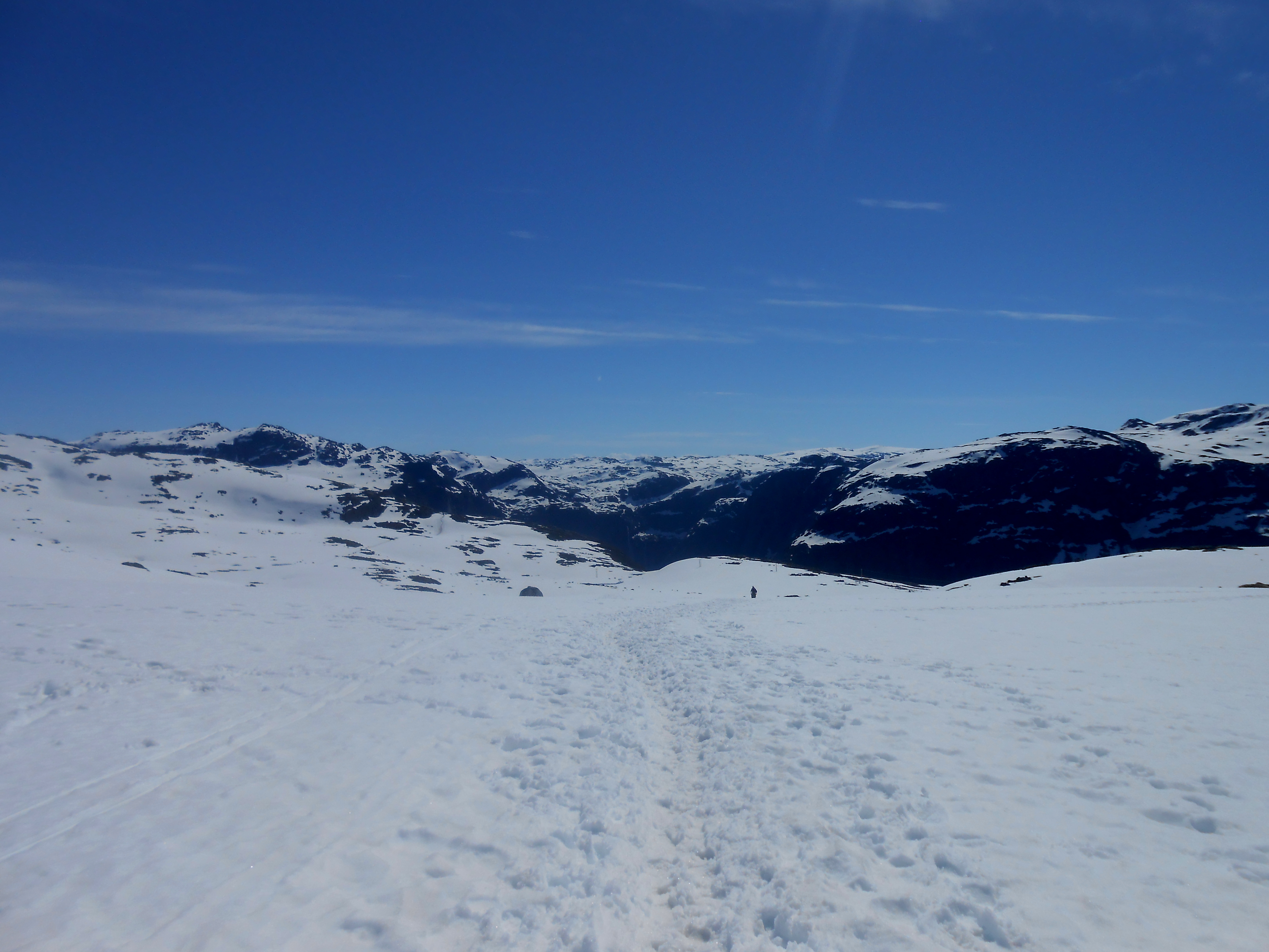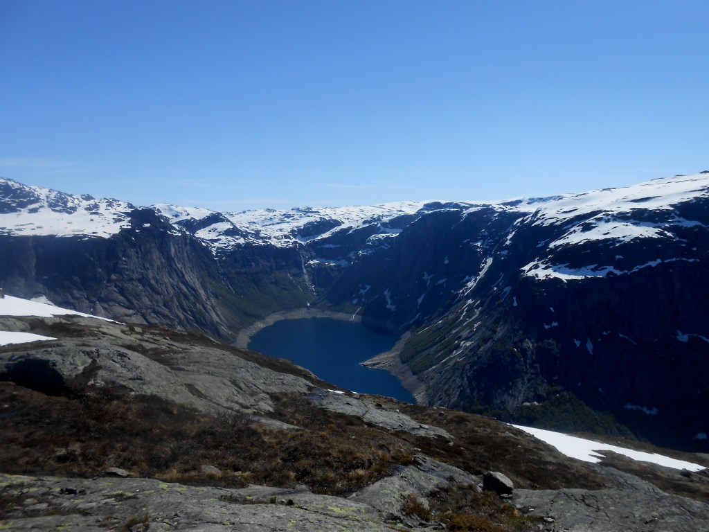 La randonnée qui démarre Skjeggedal est un trajet aller-retour de 28 kilomètres, avec un dénivelé d’environ 800 mètres et prend de 8 à 12h, pauses incluses, selon votre rythme. C’est une randonnée exigeante sur un terrain montagneux. Nous l’avons réalisée durant la fin du mois de juin et, chose à laquelle nous ne nous attendions pas et qui n’était apparemment pas « normale » à ce moment de l’année, il y avait de la neige, et pas qu’un peu !