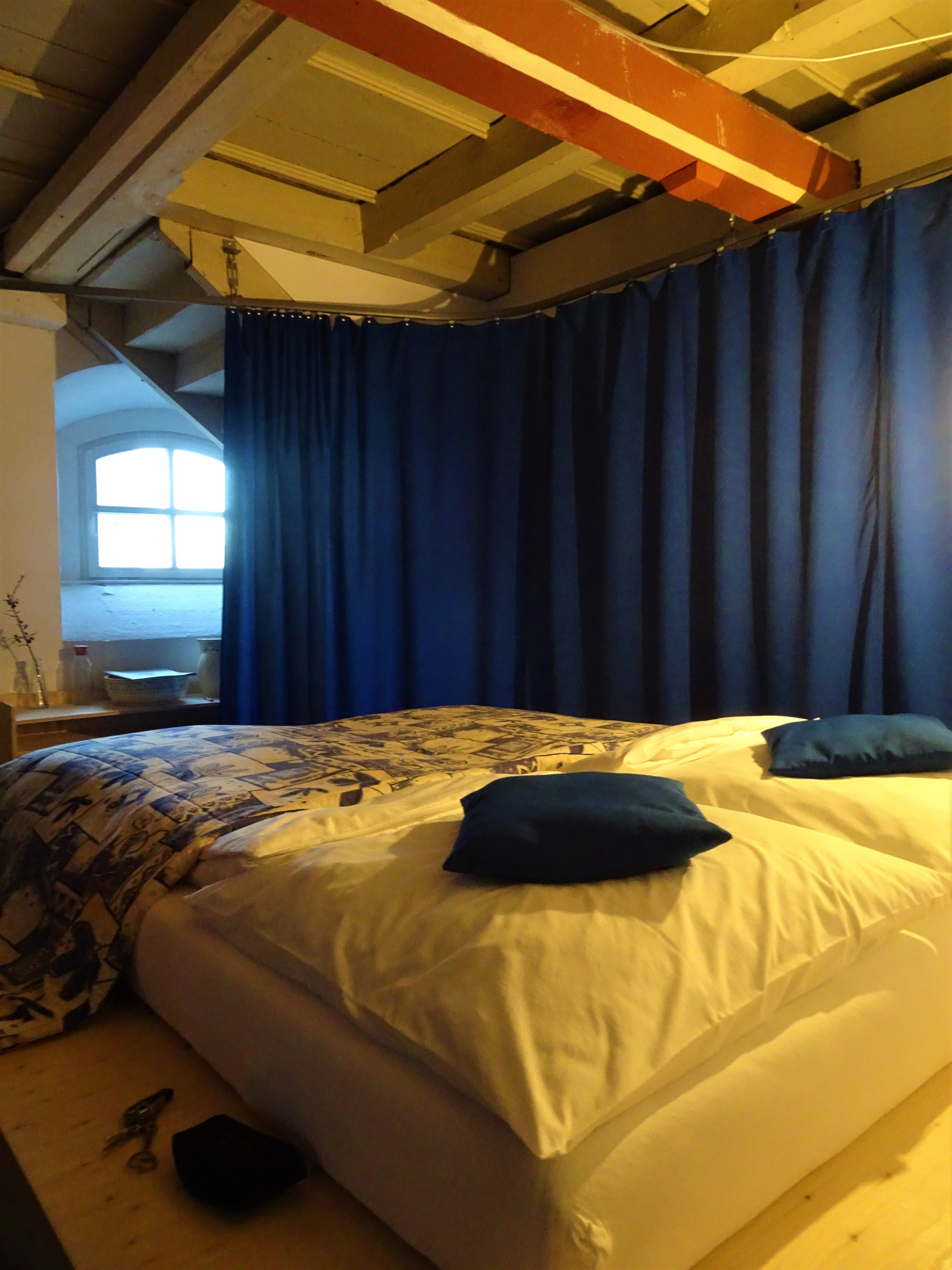 La partie chambre est séparée du reste de l’église par un rideau coulissant et est composée d’un lit double (160×200). Une cuisine entièrement équipée, le WIFI, une douche et des WC sont également disponibles dans le presbytère d’à-côté, séparé de l’église par une petite cour. Tout est très propre et accueillant.