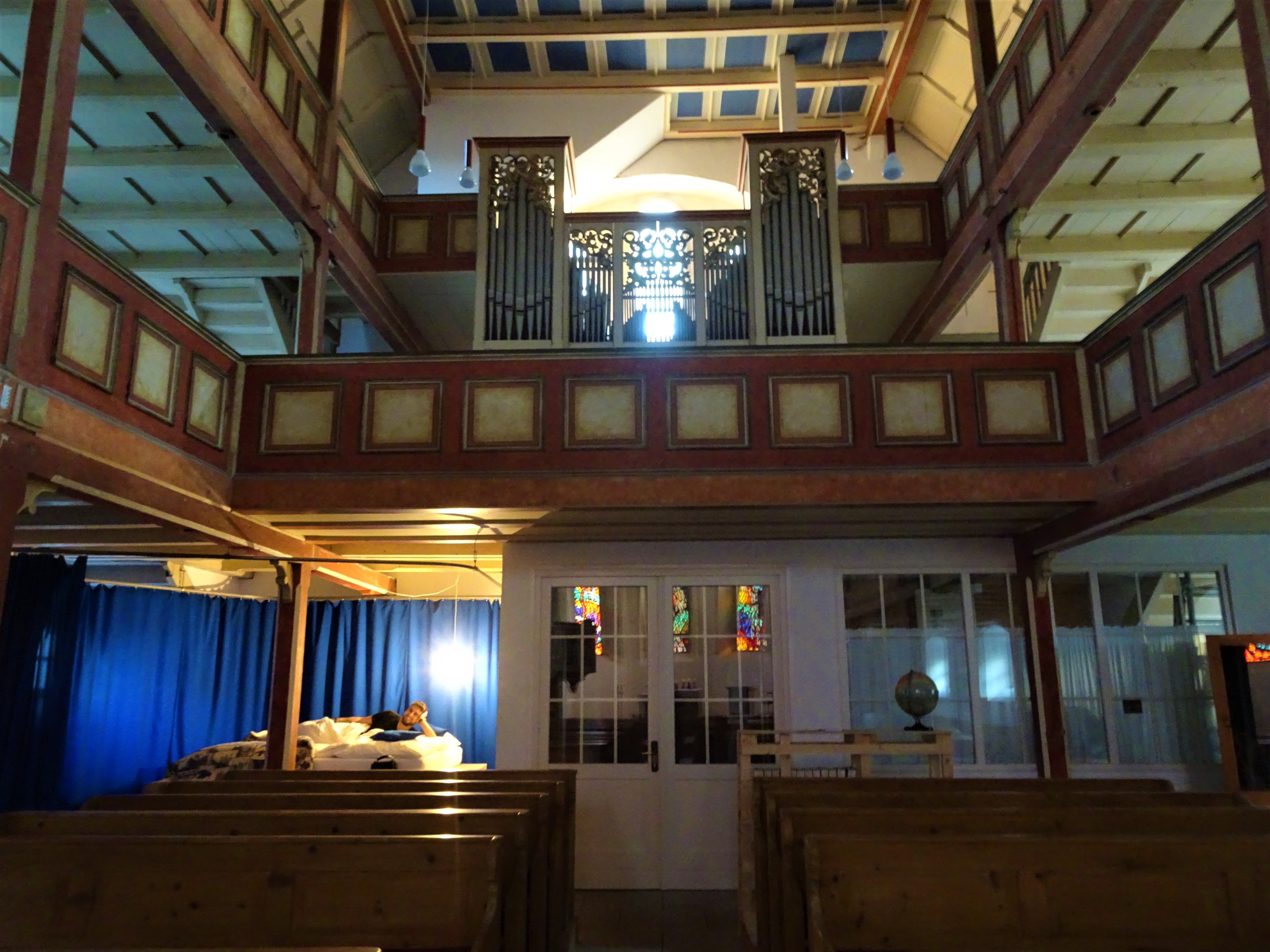 A notre arrivée, l’hôte qui s’appelle Horst est très gentil. Il nous accueille et nous montre les lieux, nous explique le fonctionnement et pourquoi il est possible de dormir dans cet endroit. L’initiative découle du concours d’idées « STADTLAND: Kirche. Penseurs latéraux pour la Thuringe 2017 ». C’est une collaboration entre architectes, l’Eglise protestante et la municipalité notamment. Horst nous laisse ensuite tranquillement nous installer. Nous en profitons pour faire un petit tour dans l’église qui est à notre entière disposition jusqu’au lendemain matin ! C’est une sensation bizarre de se retrouver seuls dans ce lieu. Tout est si calme, nos pas et nos voix résonnent tellement que nous avons tendance à parler tout bas, comme on le fait d’ailleurs habituellement dans une église. Nous jetons un œil à l’orgue, à l’autel,… Nous fouinons un peu 😅 Et nous regardons la lumière du jour baisser au travers des beaux vitraux.