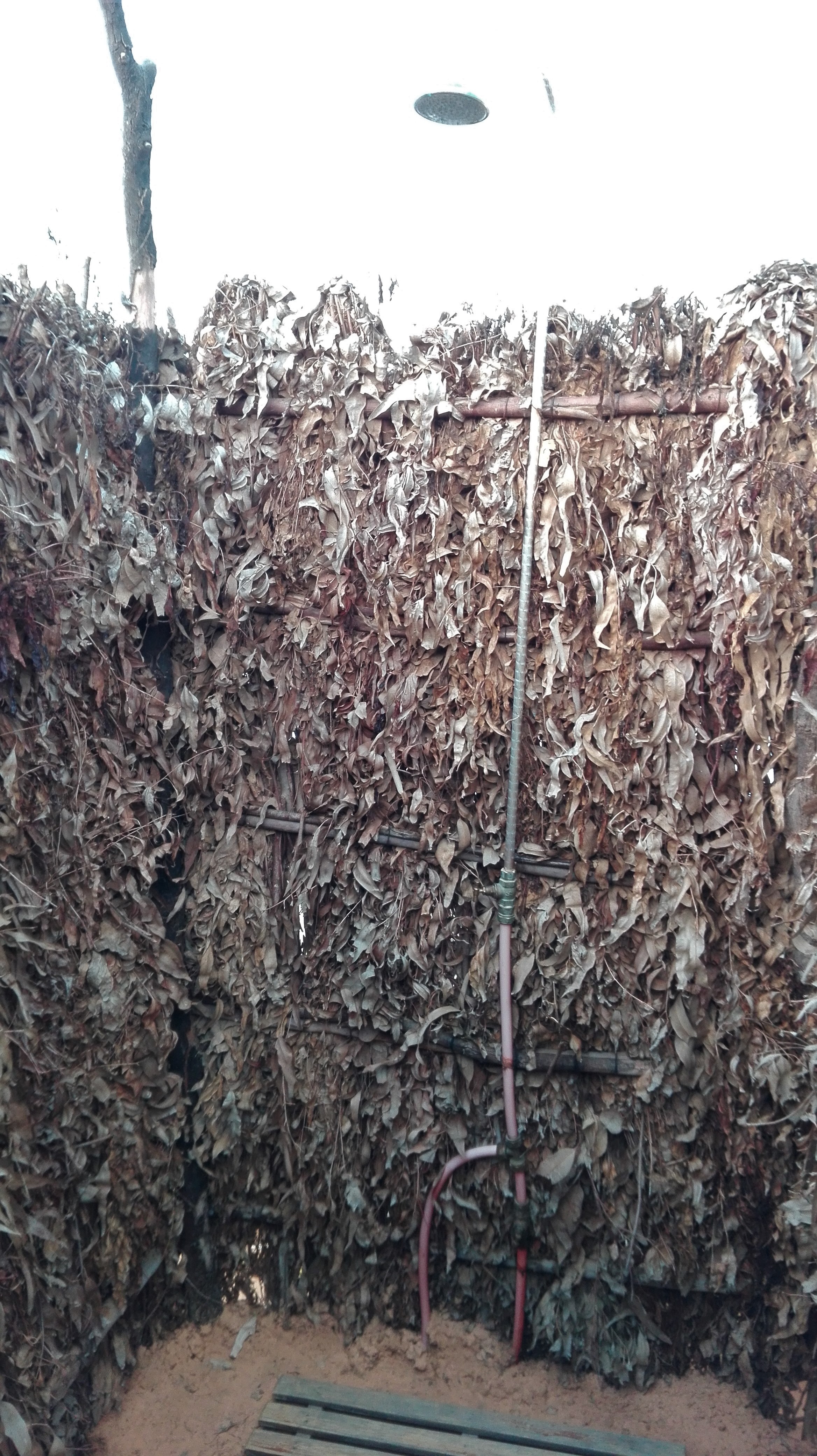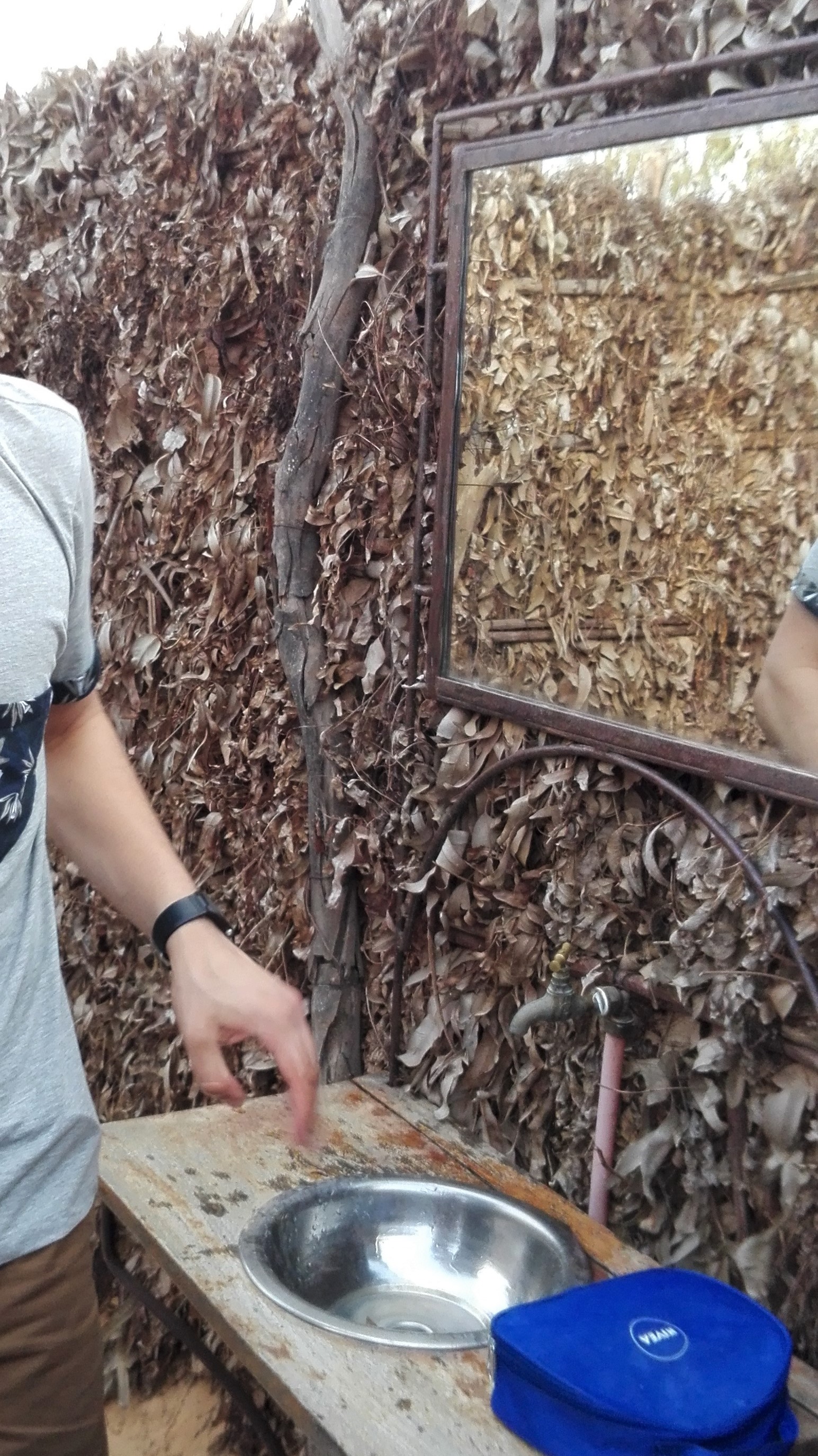 Une salle de bain individuelle est située derrière la tente avec un petit évier, un miroir, les toilettes et une douche, tout cela à ciel ouvert.