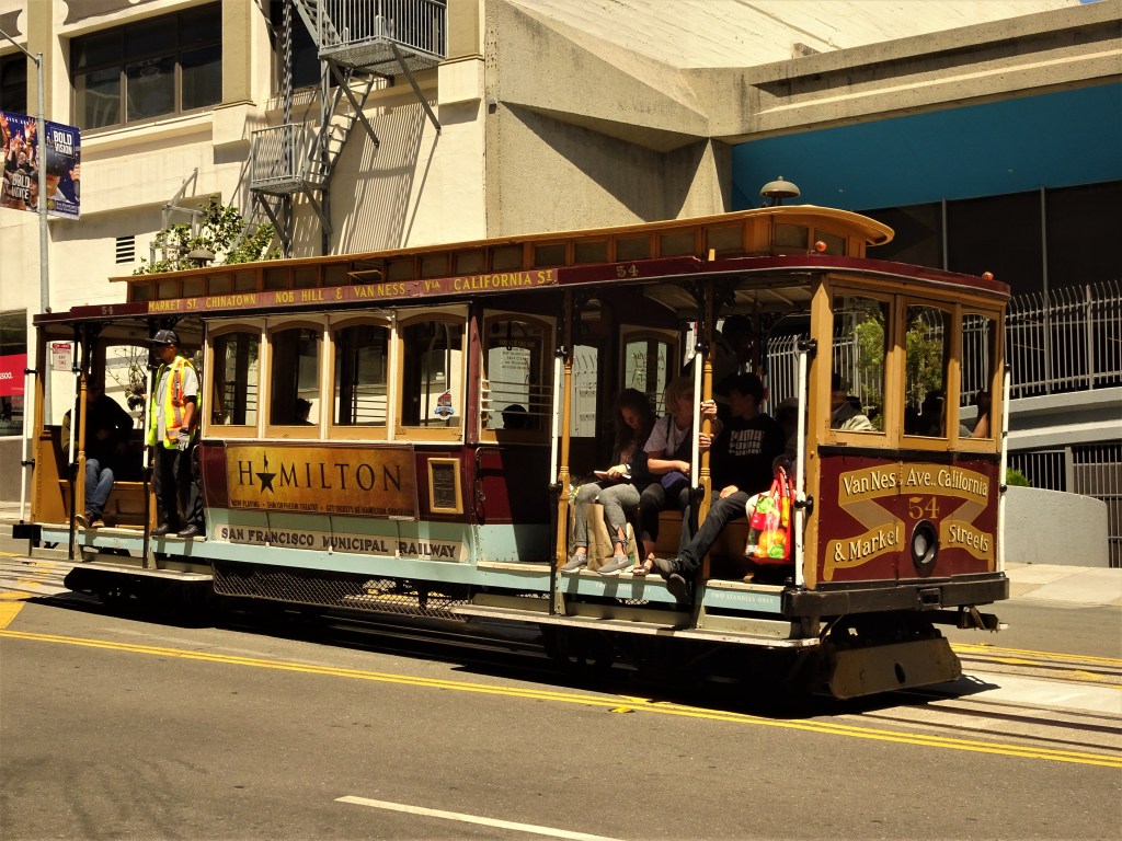 Voici une activité populaire dans la ville : prendre le cable car. Ces vieux tramways à traction par câble sont encore ouverts sur 3 lignes : California Street (ligne 61), Powell-Hyde (ligne 60) et Powell-Mason (ligne 59). Ils empruntent parfois des rues très en pente, ce qui est assez impressionnant !