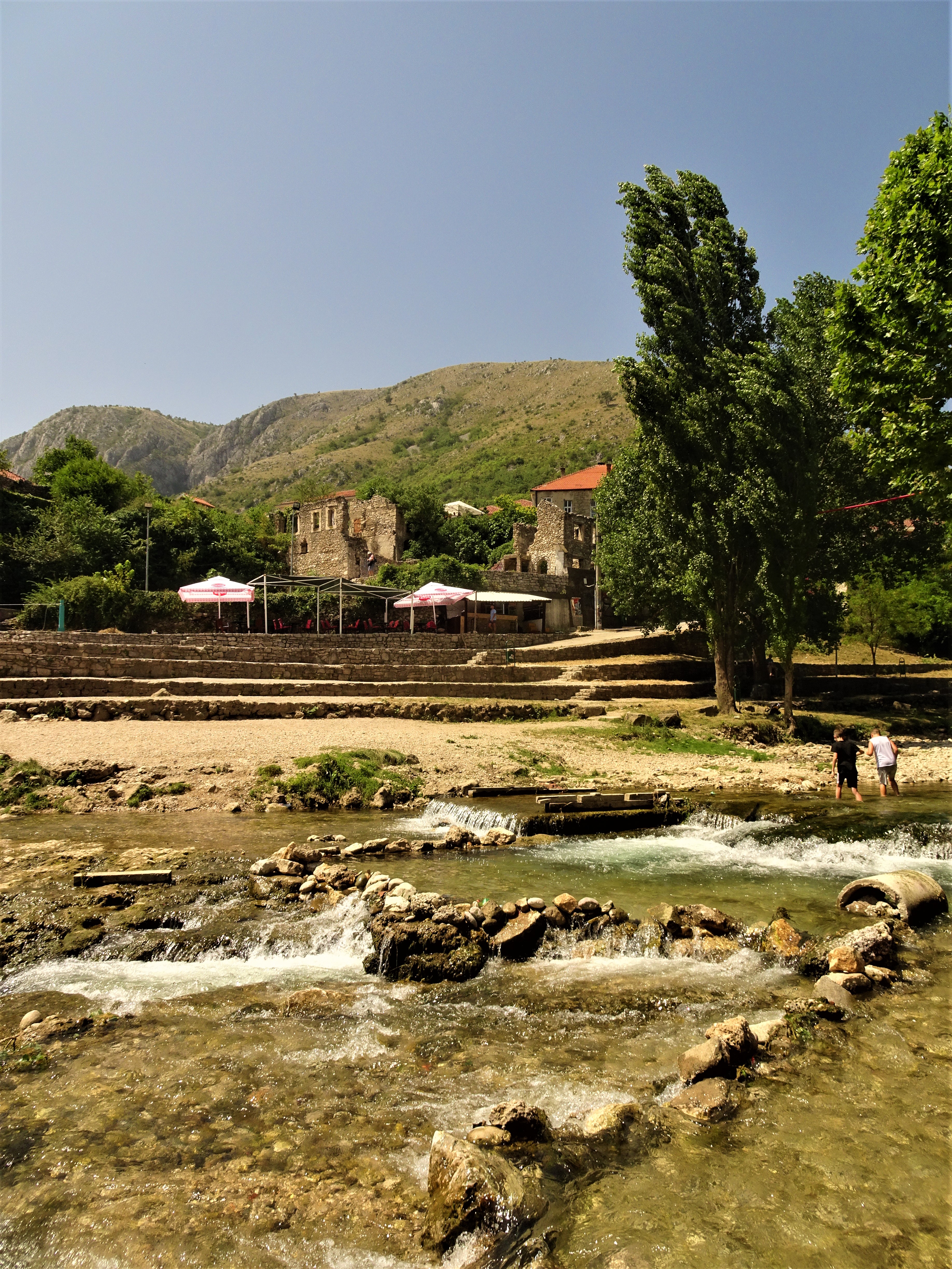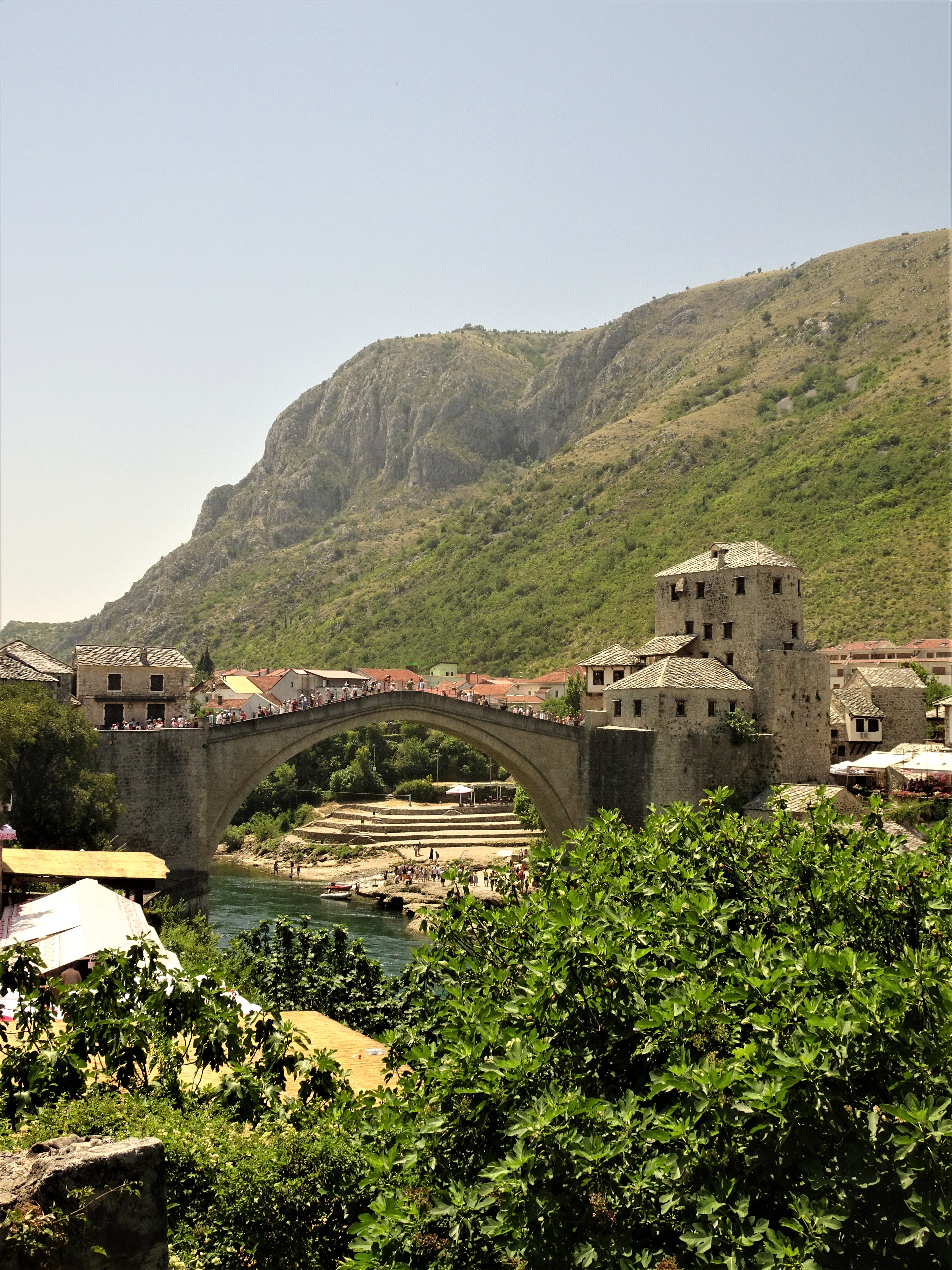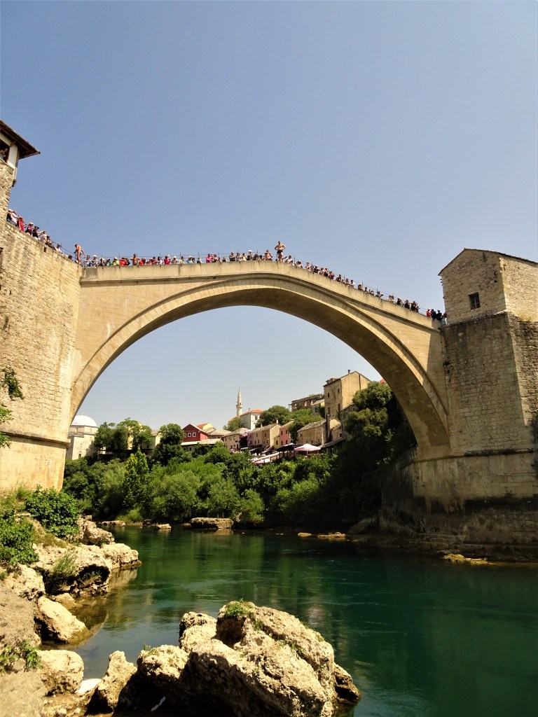 La ville a subi énormément de dégâts lors des conflits entre 1992 et 1995, affrontant serbes, croates et bosniaques. En 1993, le pont, symbole de la ville, s’écroula d’ailleurs sous les bombes des croates. Il fut reconstruit entre 2001 et 2004. Comme vous pouvez le voir sur la photo, certaines personnes sautent de ce pont. D’ailleurs, le dernier week-end de juillet, une compétition de plongeons est organisée.