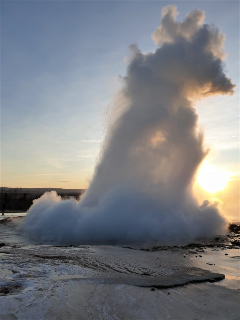 Strokkur est le geyser actif le plus visité d’Islande. Il se trouve dans la zone géothermique de Geysir, qui est le plus grand geyser actif du site. Geysir n’entre en éruption que quelques fois par jour et peur rester dormant pendant plusieurs années tandis que Strokkur a des éruptions d’eau chaude toutes les 5 à 10 minutes. L’eau peut monter à vingt mètres de haut, voire à quarante mètres exceptionnellement. C’est assez impressionnant à voir !