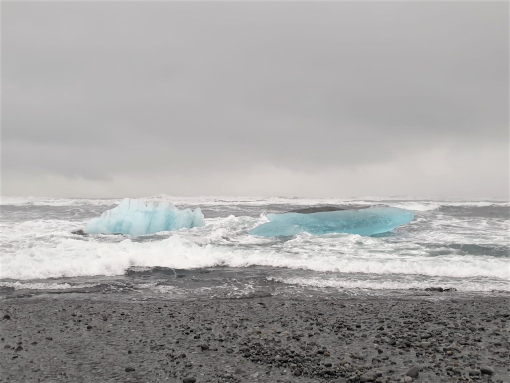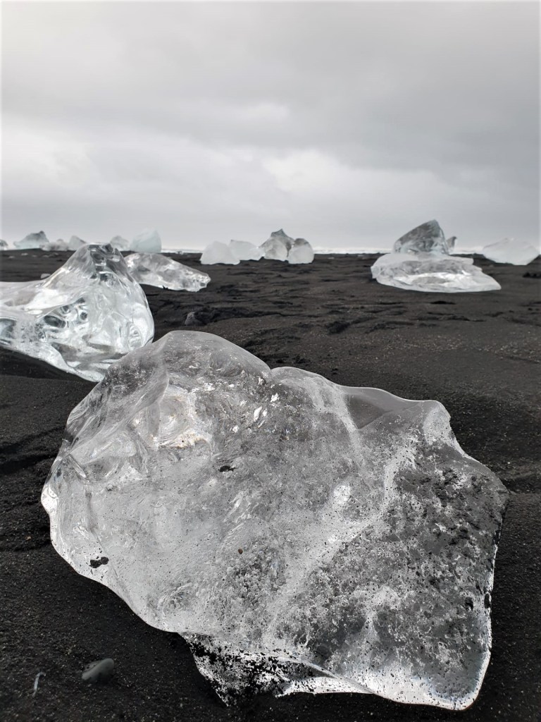 Le contraste entre la glace brillante et transparente et le noir du sable est un petit bijou pour les yeux. L’endroit est apparemment un bon spot pour observer les orques et les phoques depuis le rivage, lorsque c’est la saison.